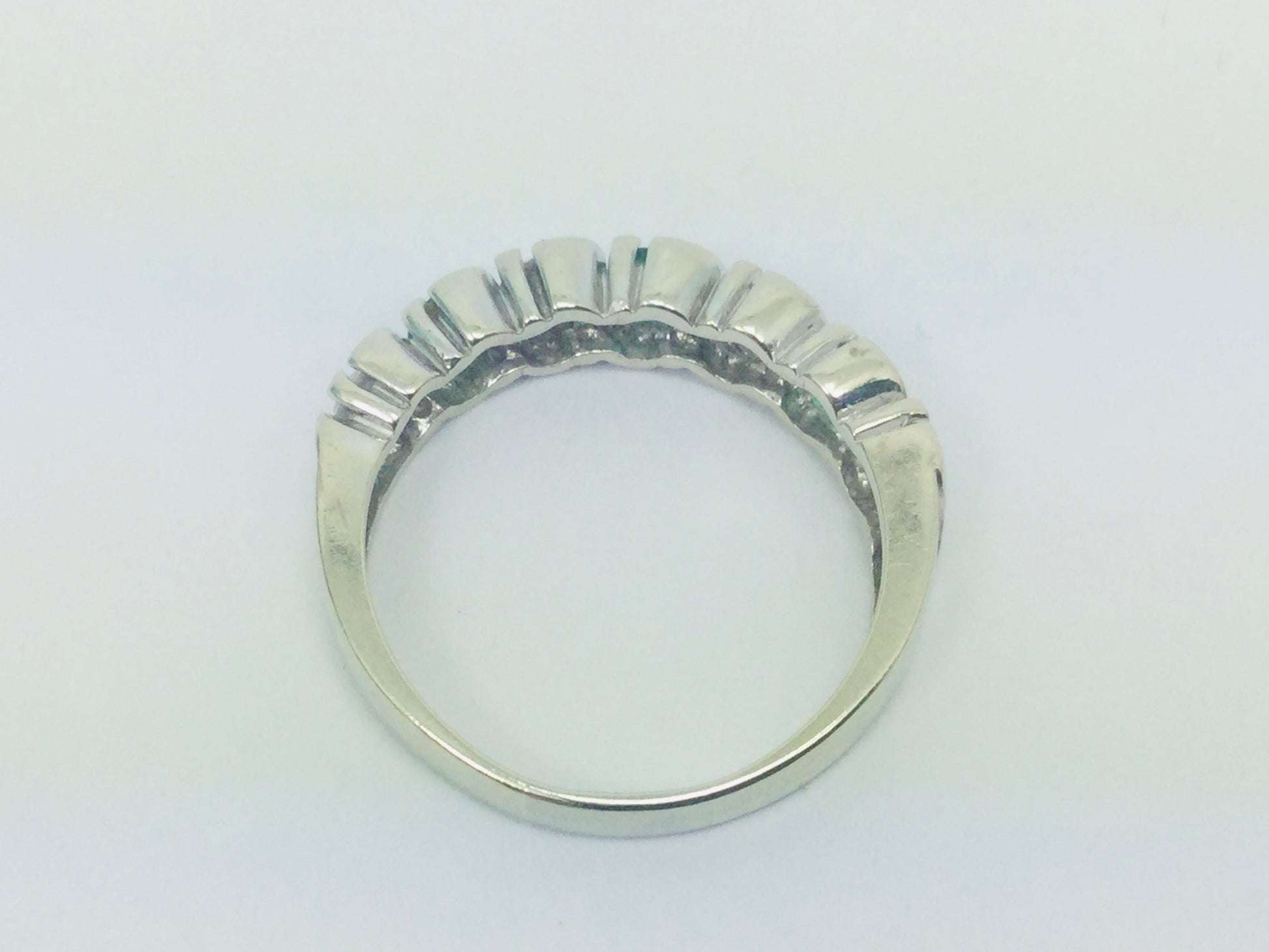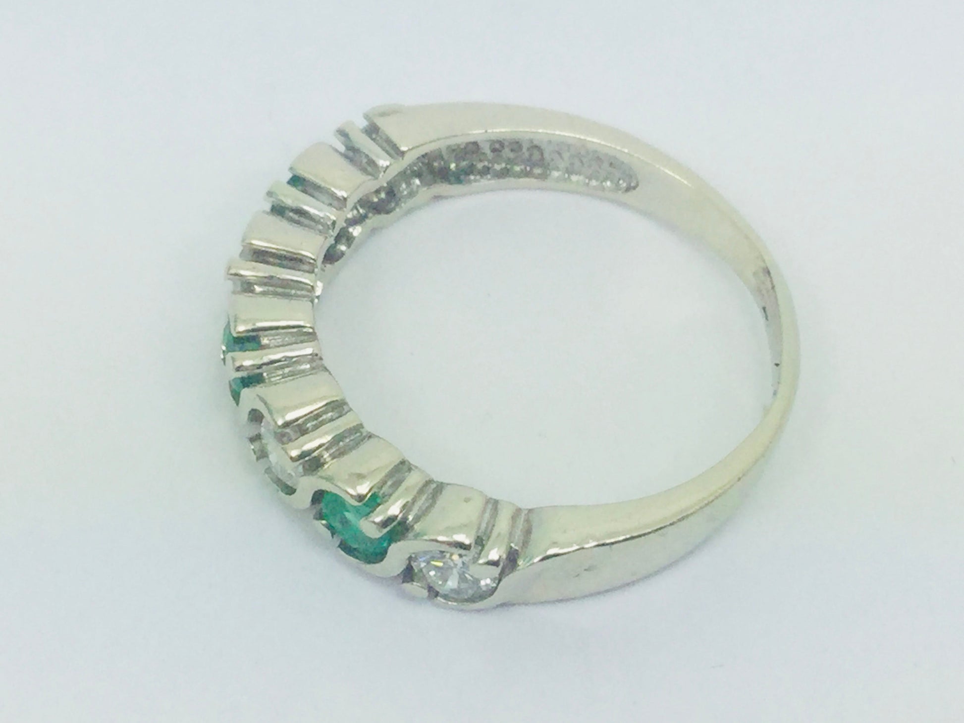 Four round cut faceted diamonds measuring approx. 3.2mm; weighing approx. 12pt. each., and three round cut faceted emeralds measuring approx. 3.2mm; weighing approx. 12pt. each.
